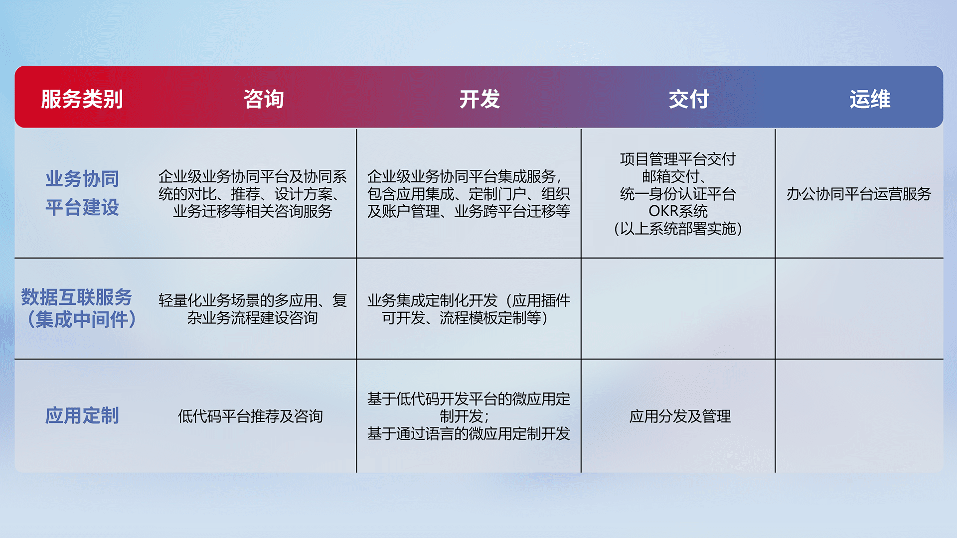 针对钉钉、、、企微、、、IDaas等平台级产品提供产品的规划、、、方案、、、、交付、、、、定制化开发等服务,,,实现如统一协同办公、、、智能客户服务、、混合会议管理、、智能数据查询、、等业务场景,,,,实现数字化转型。。