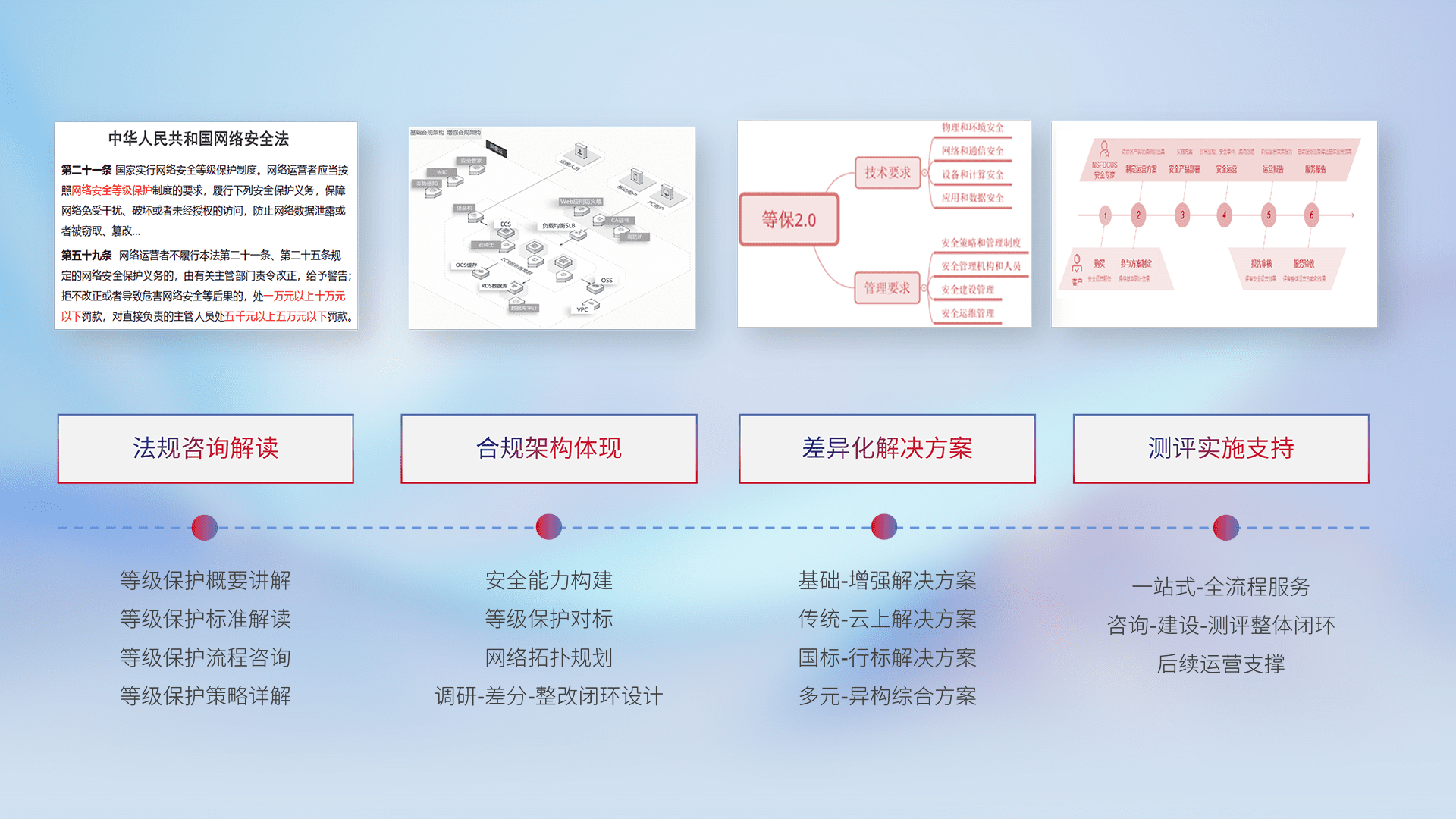 通过专业的法律咨询解读、、合规架构体现、、差异化解决方案、、测试实施支持等服务,,,,为客户量身打造等保合规体系。。